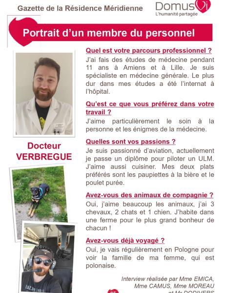 Dans le numéro de novembre-décembre, découvrez l’interview du Dr Verbregue, médecin coordonnateur de notre résidence, menée par nos résidents. Il nous explique comment il coordonne les différents professionnels de santé, internes et externes, pour assurer une prise en charge efficace et personnalisée de chaque résident.